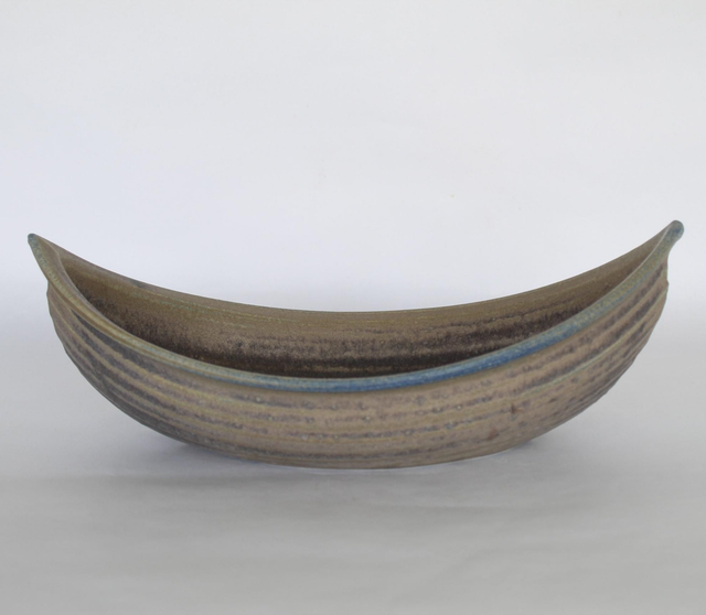 Ceramic boat with sand ripples inside base, glazed in brown-blue-grey tones that accentuate the relief patterns in the surface. 12 x 20 x 35.5cm. High fired stoneware.Made by a combination of throwing, press-moulding and slab-building techniques.