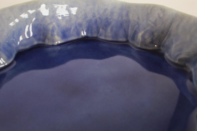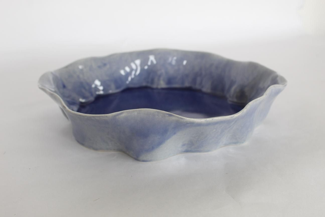 The cliffs of Kerry reflecting in the Atlantic Ocean on a still day. I was dreaming of summer when I made this. I have created the effect by using a strip of sea ripple imprinted clay for the sides, and leaving the bottom of the form completely flat and smooth. then I glazed it with a shiny and runny blue transparent glaze that pools in the bottom to create a mirror for the ripple sides. It measures 5.5 x 27 x 28cm